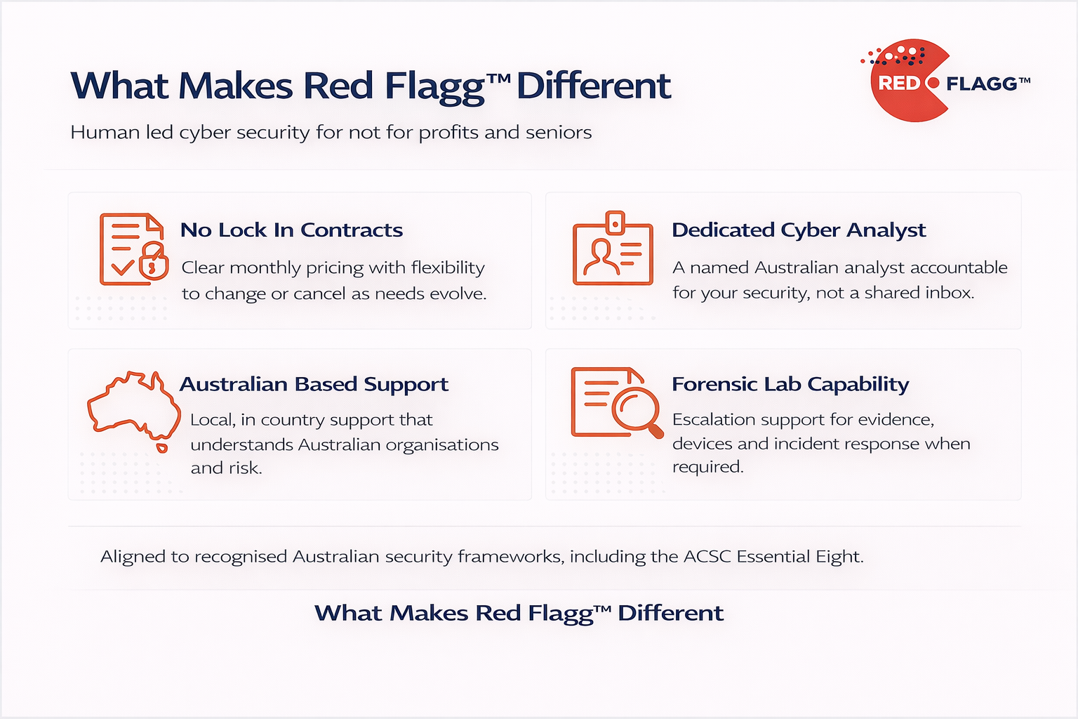 At the centre of our service is a dedicated Cyber Analyst — a real person, based in Australia, who understands how not for profits operate and works alongside your team to reduce risk in practical, realistic ways.
